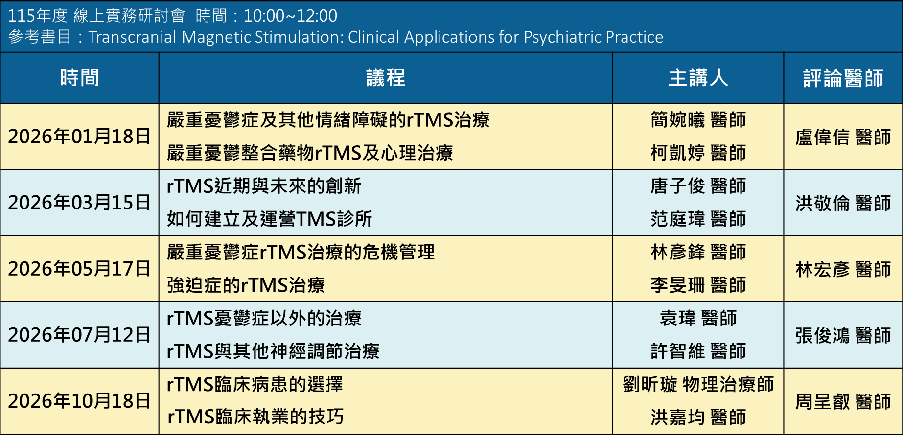 本研討會將綜覽執行 TMS 治療過程中之各項實務議題,包括個案選擇,風險管理,與藥物,心理治療之搭配,以及個案管理。同時,我們也將探討 TMS 在其他精神疾患及身體疾病之應用,並介紹台灣現有之 TMS 治療系統,以及其他神經調節術的發展與創新。本研討會將由報告醫師結合臨床經驗,針對參考書目進行摘要講述,並由評論醫師補充實務考量與運作。