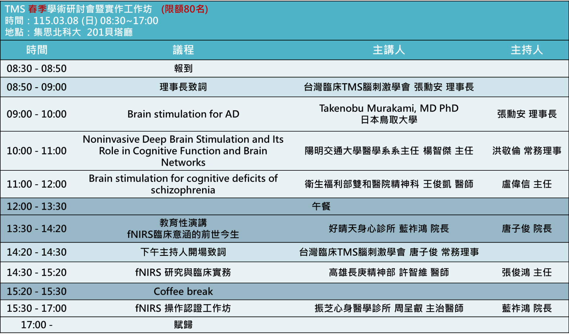 本研討會將綜覽執行 TMS 治療過程中之各項實務議題,包括個案選擇,風險管理,與藥物,心理治療之搭配,以及個案管理。同時,我們也將探討 TMS 在其他精神疾患及身體疾病之應用,並介紹台灣現有之 TMS 治療系統,以及其他神經調節術的發展與創新。本研討會將由報告醫師結合臨床經驗,針對參考書目進行摘要講述,並由評論醫師補充實務考量與運作。
