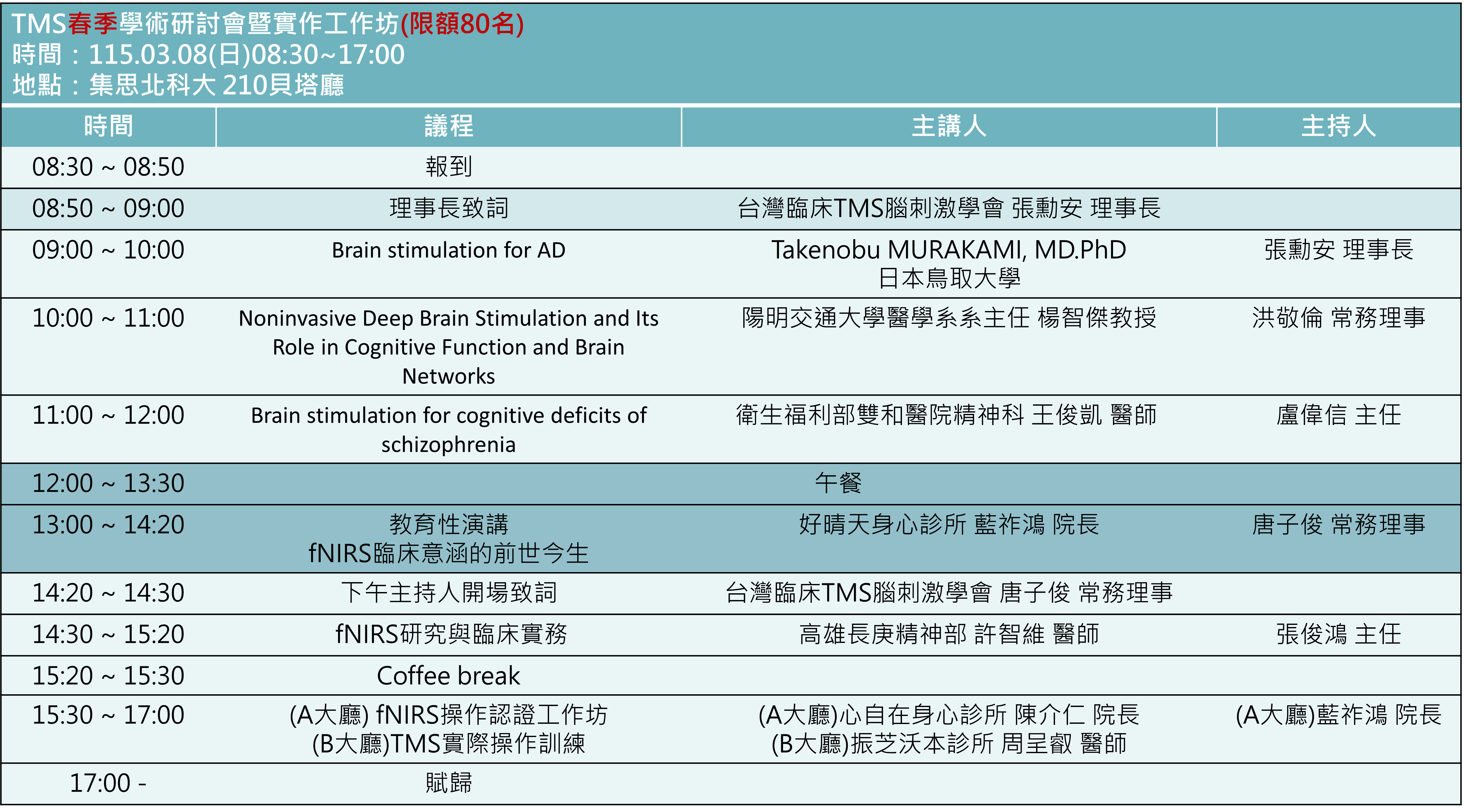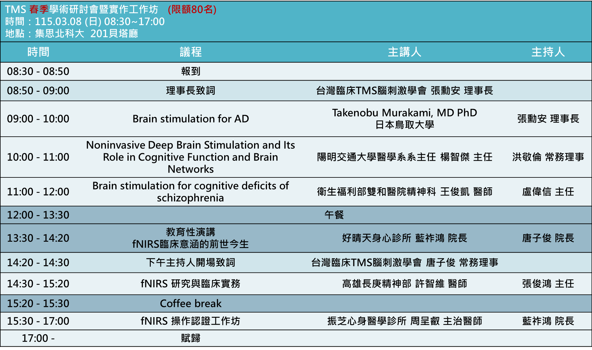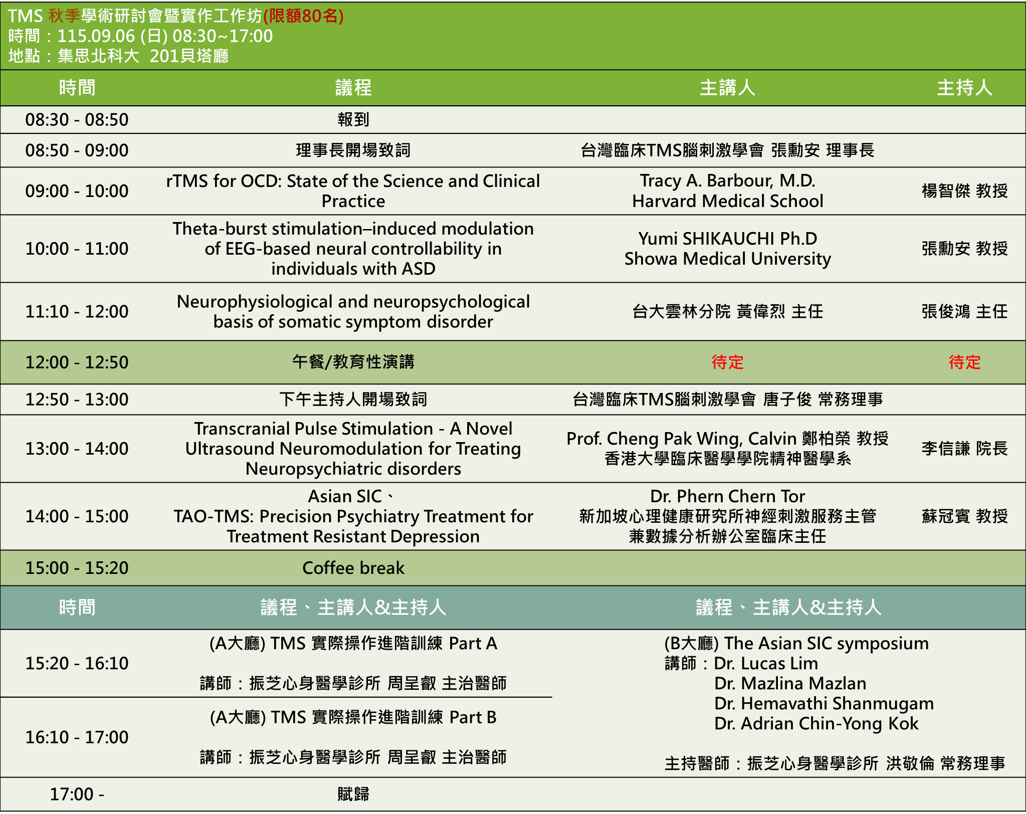 本研討會將綜覽執行 TMS 治療過程中之各項實務議題,包括個案選擇,風險管理,與藥物,心理治療之搭配,以及個案管理。同時,我們也將探討 TMS 在其他精神疾患及身體疾病之應用,並介紹台灣現有之 TMS 治療系統,以及其他神經調節術的發展與創新。本研討會將由報告醫師結合臨床經驗,針對參考書目進行摘要講述,並由評論醫師補充實務考量與運作。