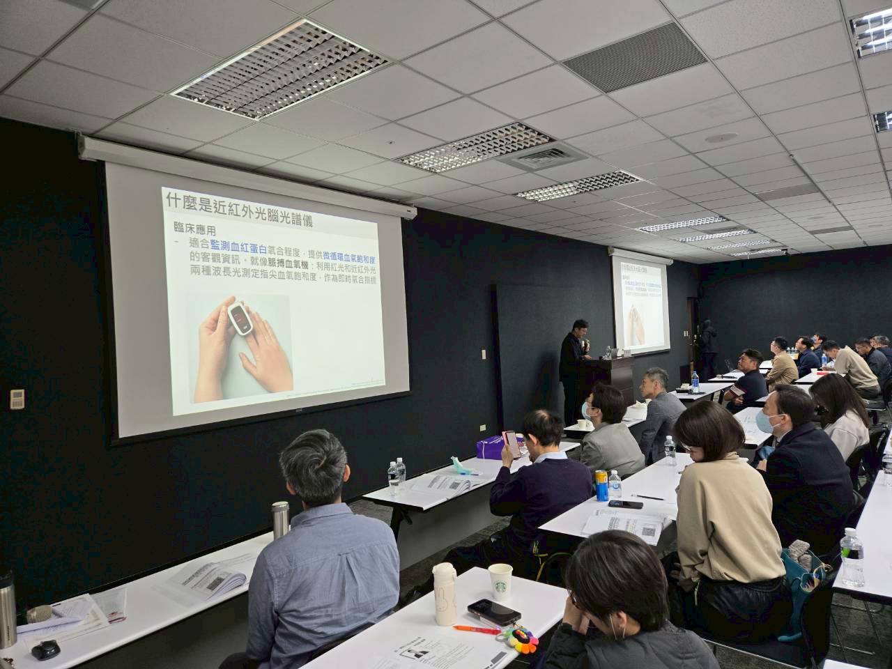 接下來到了春季會的壓軸「fNIRS 操作認證工作坊」以及「TMS 實際操作訓練」,第一部分「 fNIRS 操作認證工作坊 」實作由藍祚鴻院長以及陳介仁醫師、吳佩真專員為大家帶領,同時另一場地也正進行著「TMS 實際操作訓練 」,由周呈叡醫師、李柏翰醫師與郭芝吟專員為大家帶領實際示範,兩種實作課程皆安排讓學員們可以自由練習,指導各位學員操作細節,除了讓大家都有機會學習到儀器操作、更能親身體驗患者接受治療時的感受,最後研討會也在充實的學習討論中畫下完美句點,相信每一位學員都受益良多。